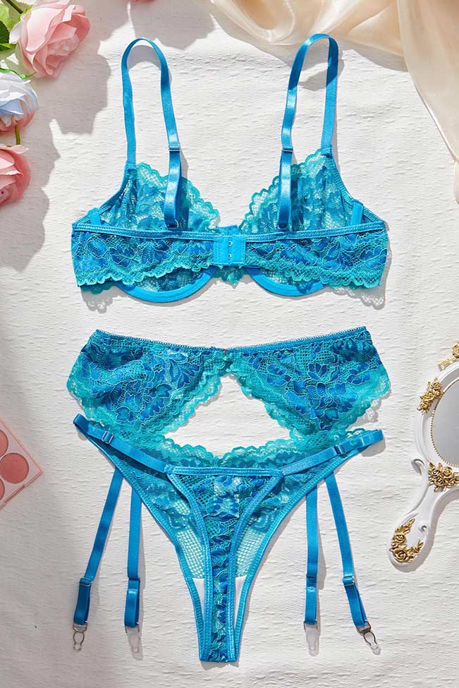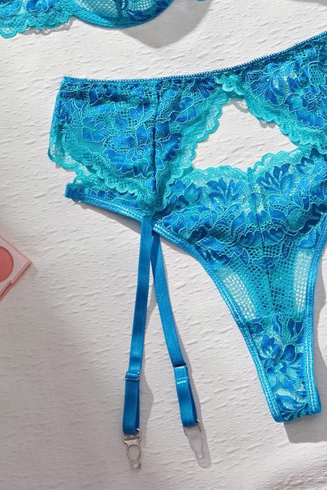 Γαλάζιο σετ εσωρούχων δαντέλας με ζαρτιέρες