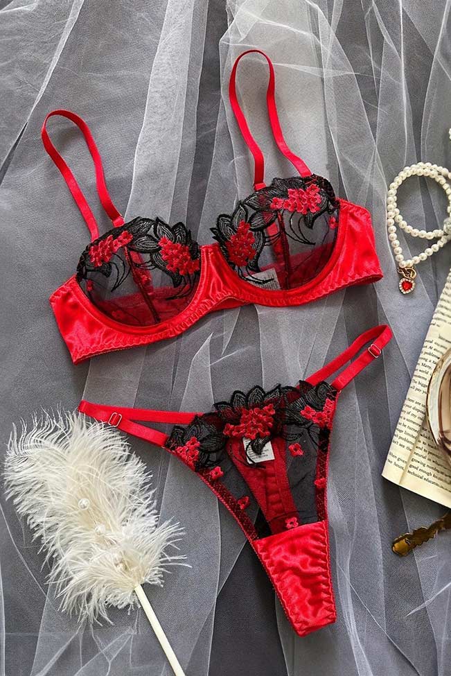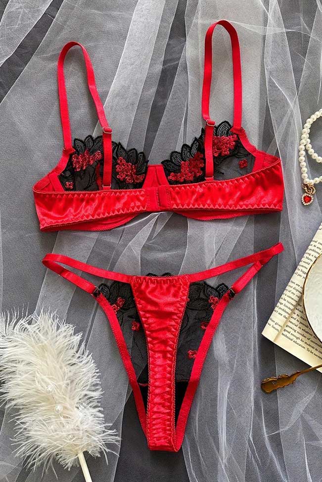 Σετ brallet με κέντημα λουλουδιών πάνω σε διαφάνειες και στρινγκ με χαμηλή μέση.