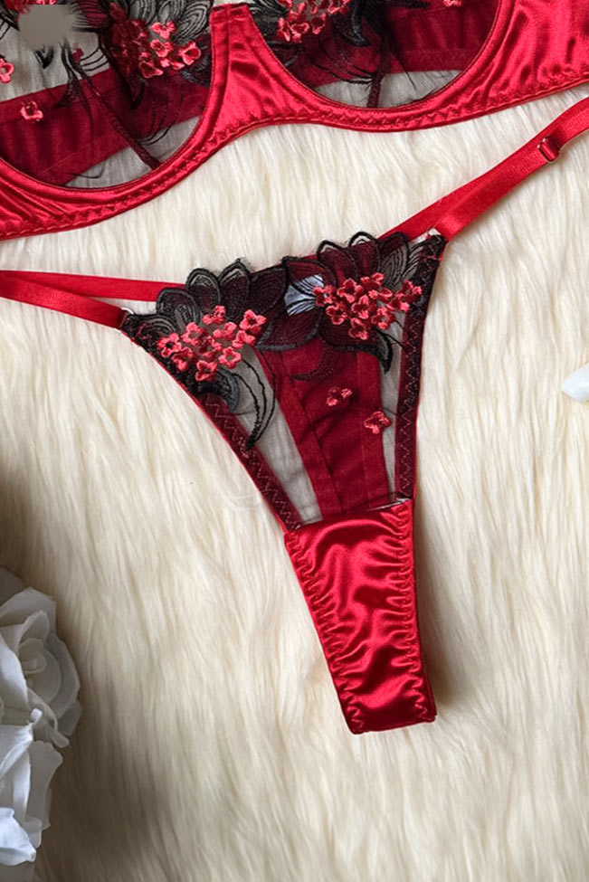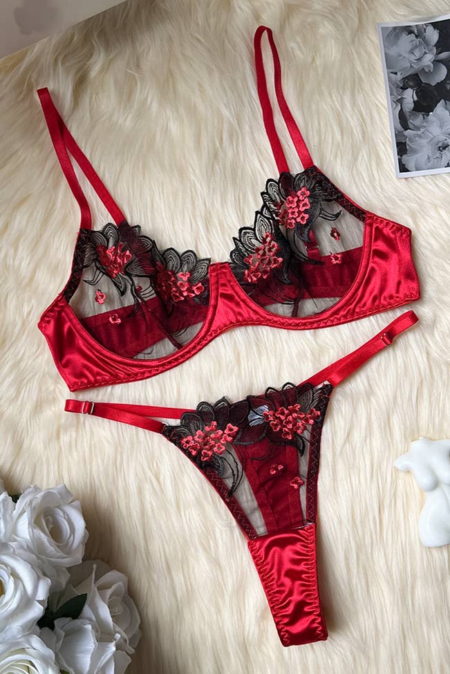 Σατέν σετ εσωρούχων με φλοράλ κεντήματα σε κόκκινο