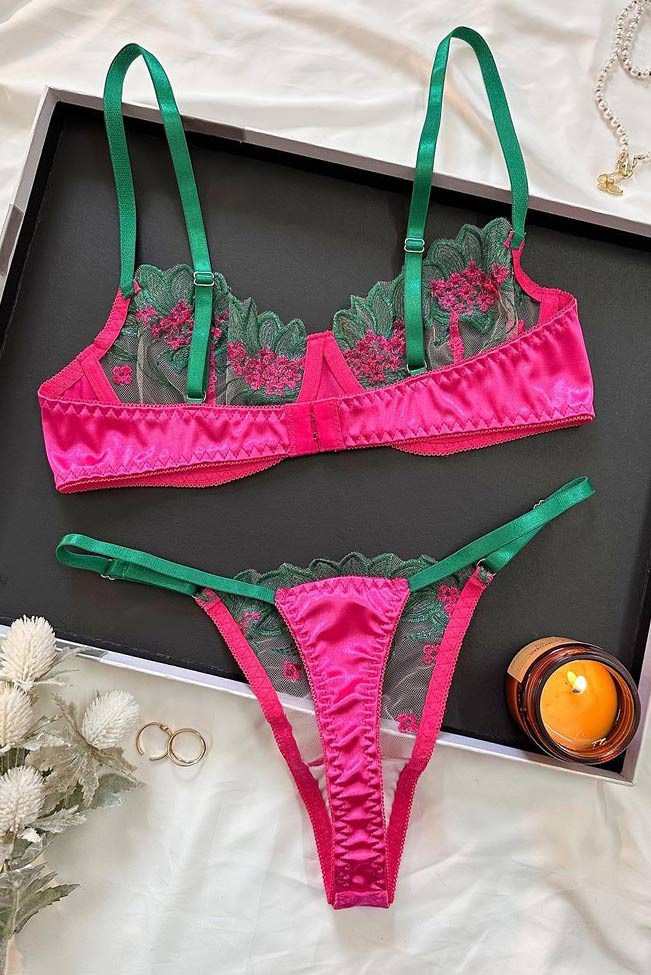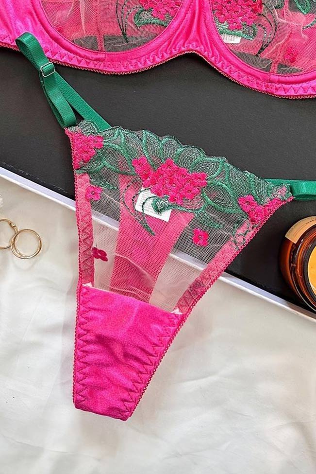 Σετ brallet με κέντημα λουλουδιών πάνω σε διαφάνειες και στρινγκ με χαμηλή μέση.