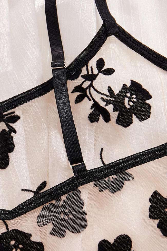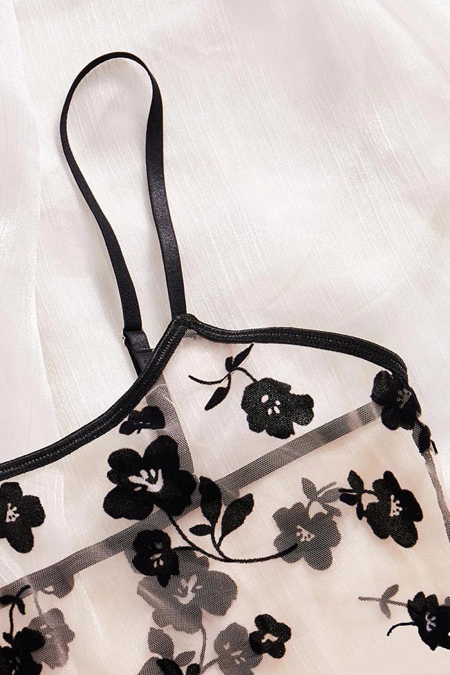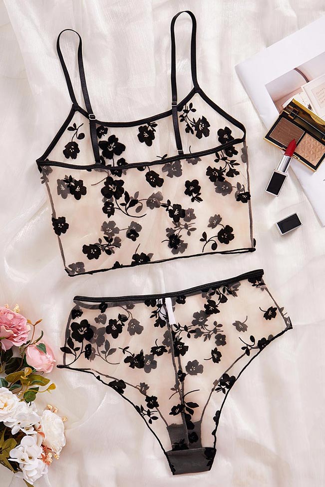 Διάφανο σετάκι με μαύρα λουλουδάτα κεντήματα. Έχει λεπτές ρυθμιζόμενες τιράντες και ψηλόμεσο σλιπάκι.