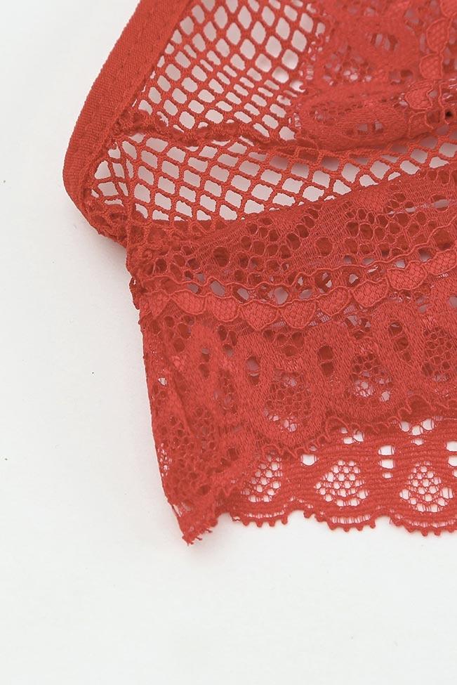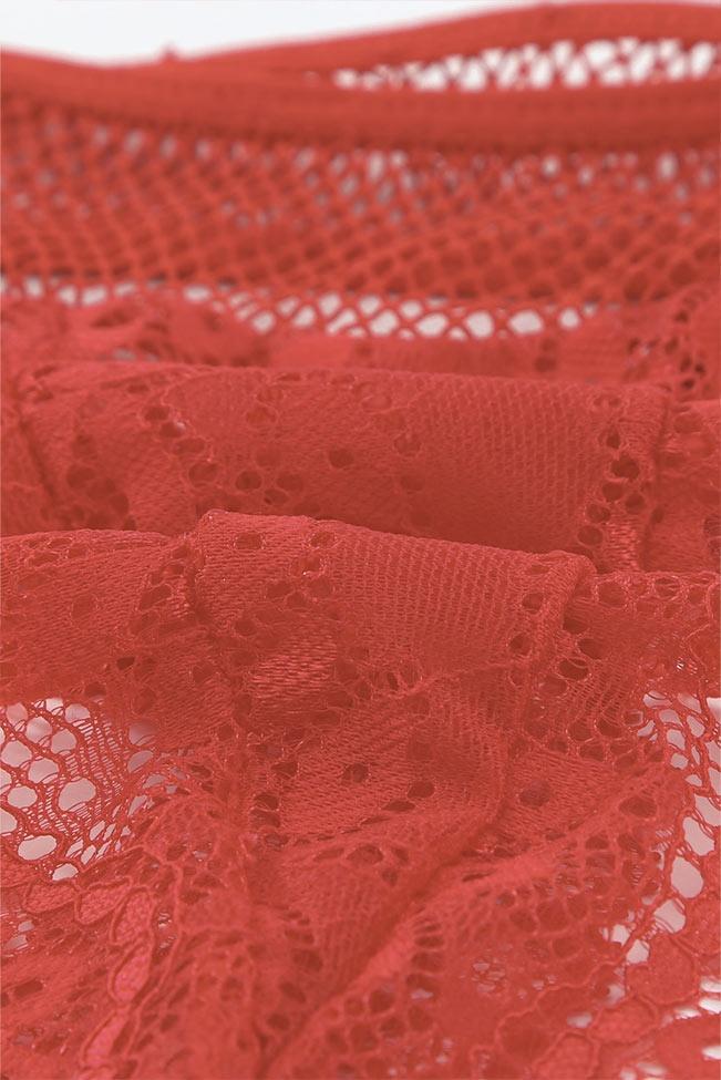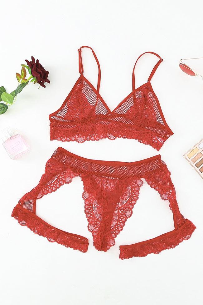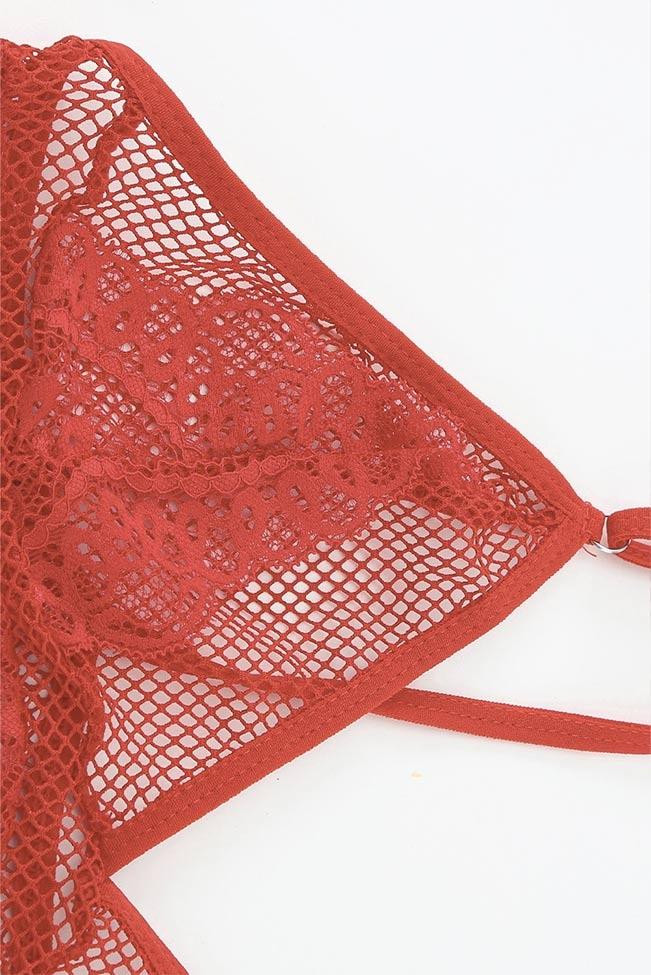 Σετ lingerie με ενσωματωμένη καλτσοδέτα, G-string με fishnet που εφαρμόζει ψηλά, σε μοναδικό κόκκινο χρώμα. Έχει δαντέλα και δίχτυ, ένα bralettάκι σετ που θα αναδείξει την πιο θηλυκή πλευρά σου.