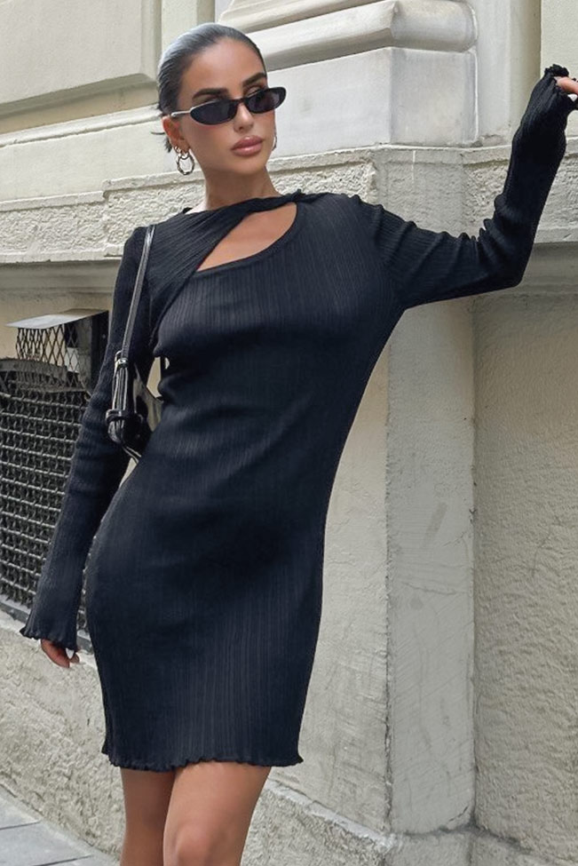 Rib μίνι μαύρο μακρυμάνικο φόρεμα με cut out στο μπούστο. Είναι ελαστικό εφαρμοστό και αναδεικνύει απόλυτα τις καμπύλες. One Size καλύπτει από Small μέχρι Medium νουμεράκι.