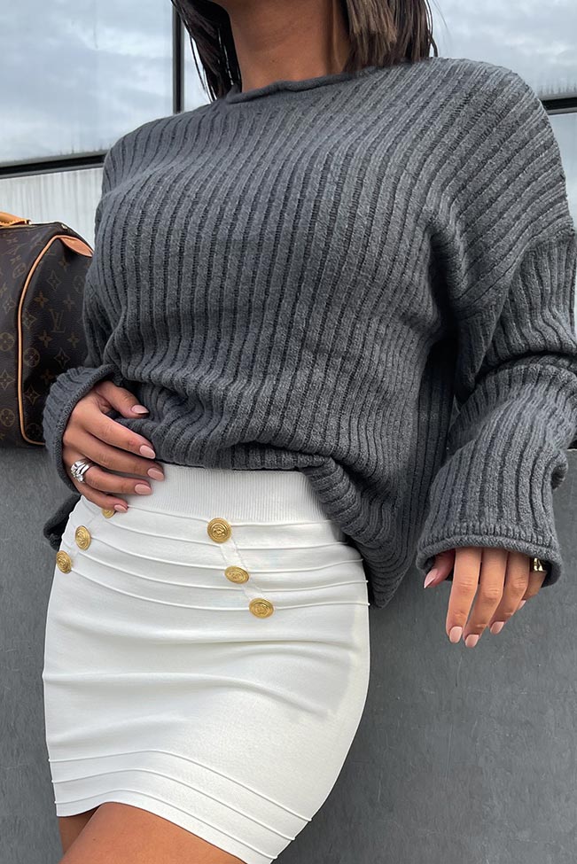 Μακρυμάνικο γκρι πλεκτό με στρογγυλή λαιμόκοψη. Είναι onesize και καλύπτει από small μέχρι large.