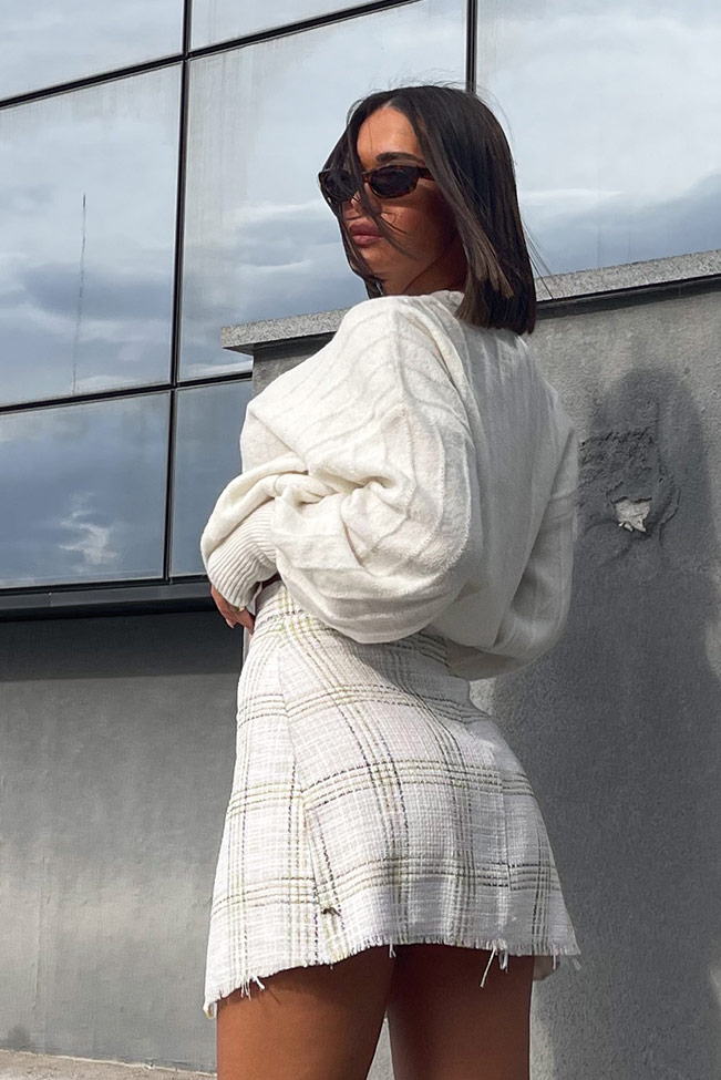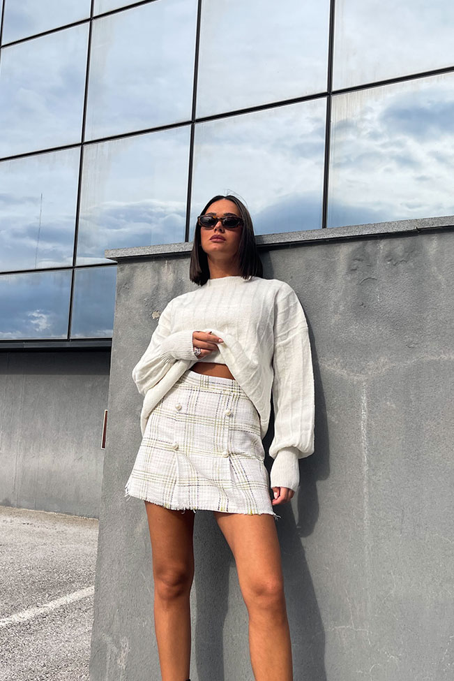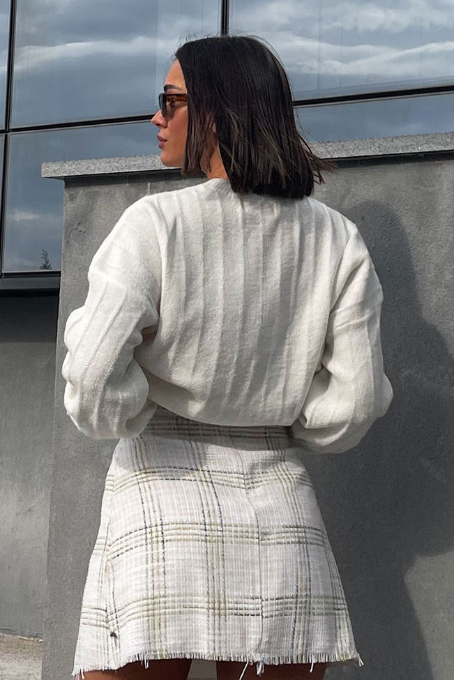 Μακρυμάνικο λευκό πλεκτό με στρογγυλή λαιμόκοψη και μοναδικές ραφές στα μανίκια και all over. Είναι onesize και καλύπτει από small μέχρι large.