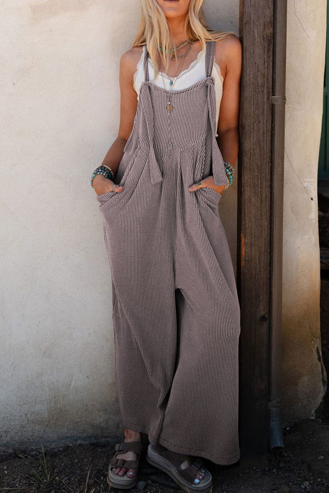 Αναβαθμίστε το casual στυλ σας με αυτή την υπέροχη ολόσωμη φόρμα σε γκρι απόχρωση! Το ανάλαφρο ριμπ ύφασμα χαρίζει άνεση και ελευθερία κινήσεων, ενώ η oversized γραμμή προσφέρει ένα ανεπιτήδευτα σικ look. Οι λεπτομέρειες με κόμπους στις τιράντες προσθέτουν μια boho πινελιά, καθιστώντας την ιδανική επιλογή για καθημερινές εμφανίσεις ή χαλαρές βόλτες