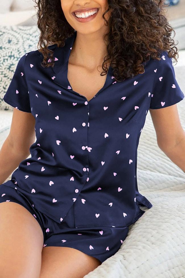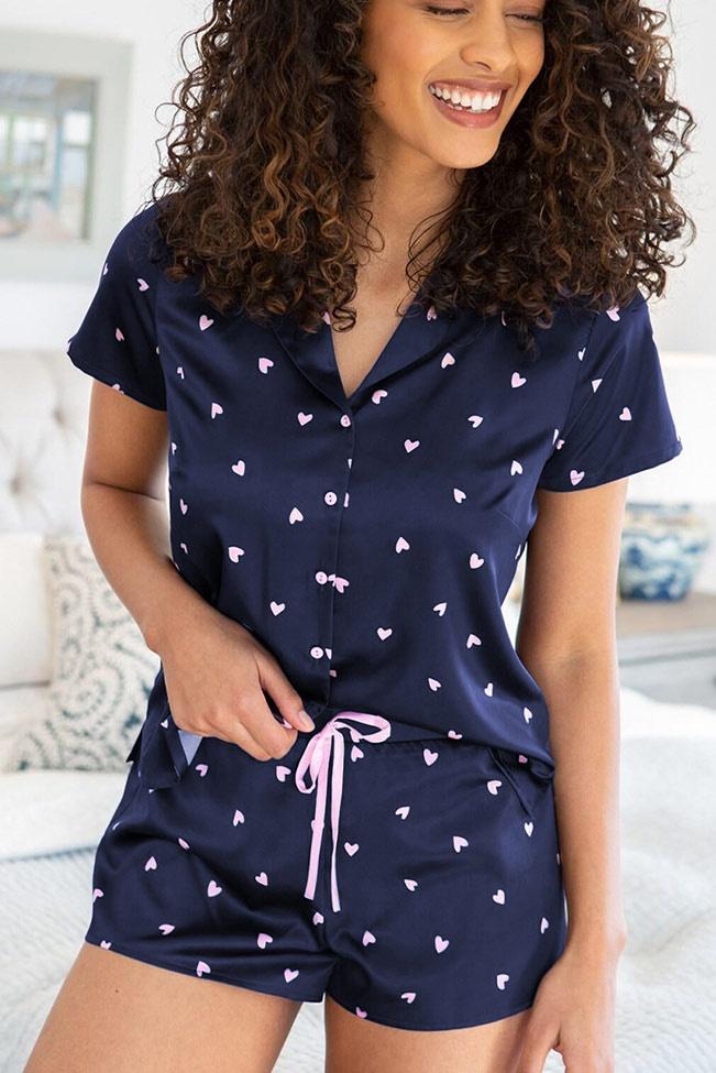 Σούπερ μαλακές και άνετες μπλε σατέν πιτζάμες με καρδούλες. Το μπλουζάκι έχει κουμπάκια για απόλυτη άνεση ενώ το σορτσάκι με το λάστιχο που αγκαλιάζει την μέση, το κάνουν εξαιρετικό για σαββατοκύριακα στο κρεβάτι χωρίς δεύτερη σκέψη. Αυτά τα πιτζαμάκια θα γίνουν τα αγαπημένα σας.