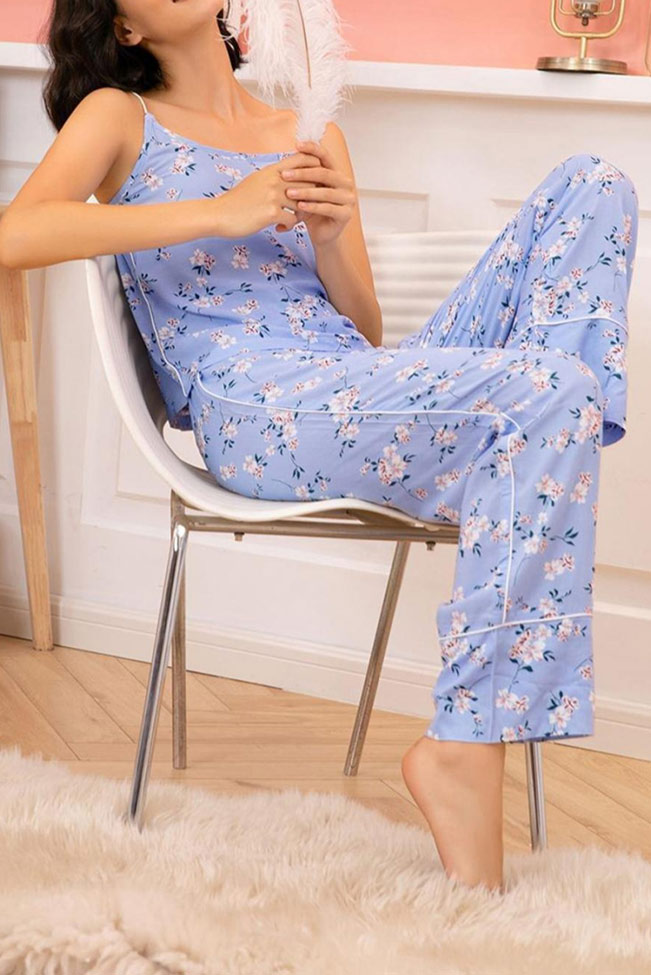 Αδιαμφισβήτητη προτεραιότητα: η ατελείωτη άνεση! Γαλάζιο floral loungwear σετ με τοπ τιραντάκι και παντελόνι με ελαστικό λάστιχο στην μέση.