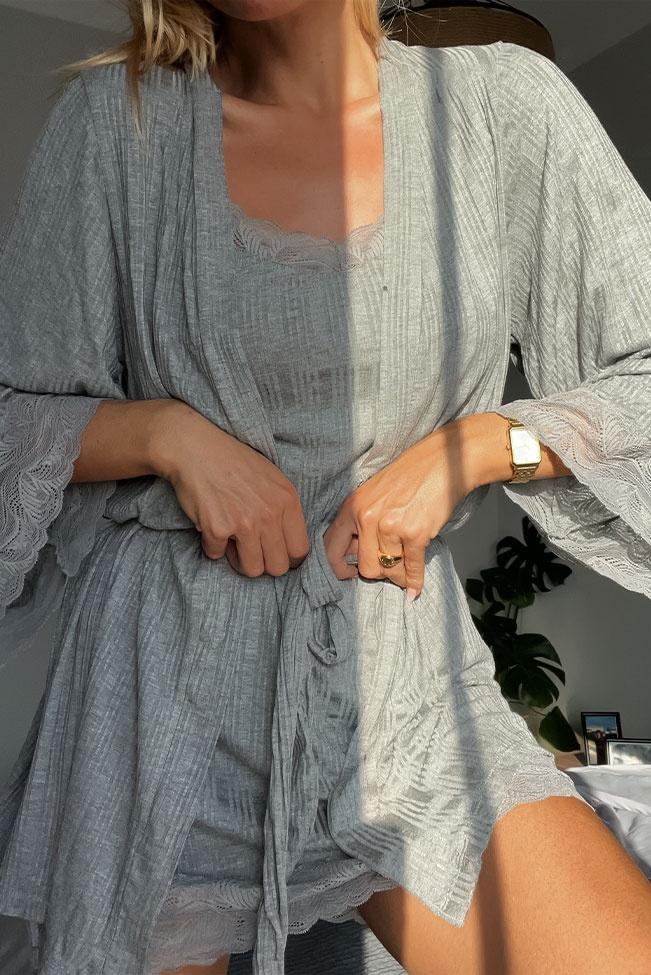 Ριμπ σετάκι πιτζάμας σε 3 χρώματα, απαλό ροζ, neutral γκρι και pure black με άνετη κομψή ρόμπα. Το αμάνικο μίνι φόρεμα με τη δαντέλα και η ασορτί αεράτη ρόμπα με λουράκι στη μέση του δίνουν ένα vintage look. Έχει μακριά μανίκια με μονόχρωμες μπορντούρες με δαντέλα στην ίδια απόχρωση.