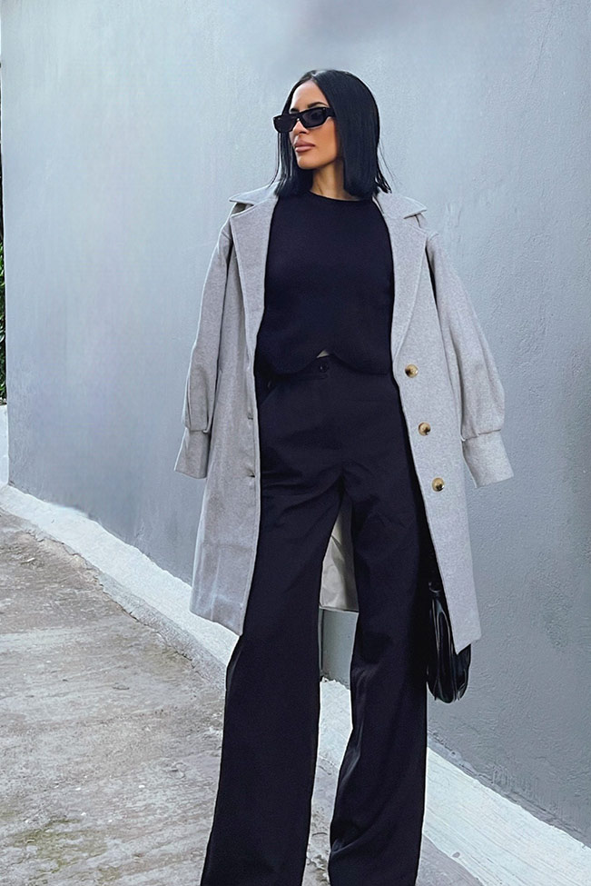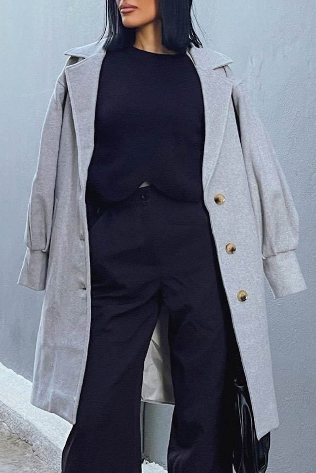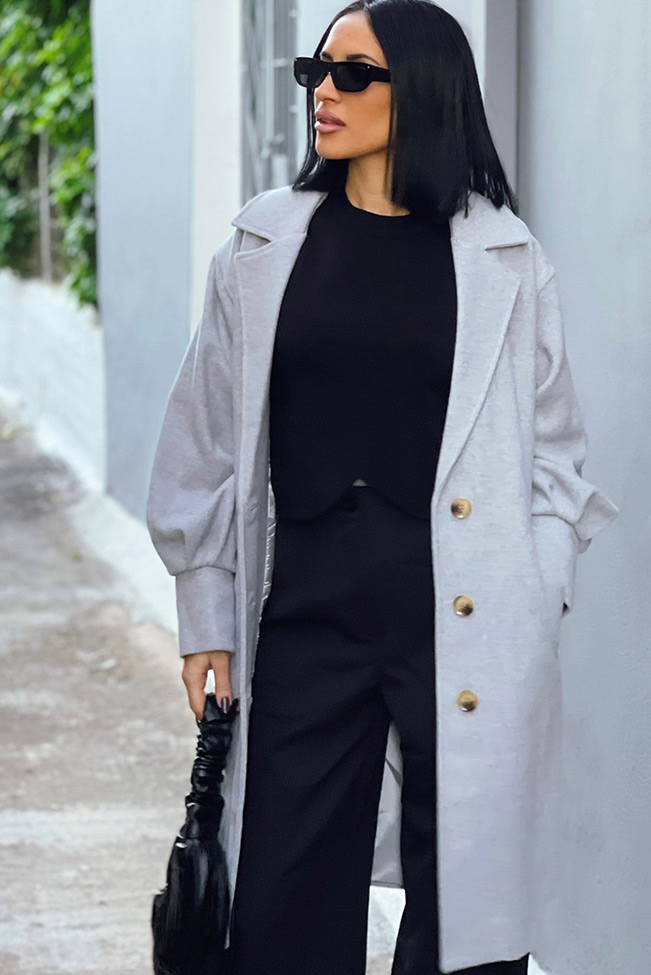 Γκρί παλτό με κουμπιά και balloon φουσκωτά μανίκια στη μέση για φθινοπωρινές εμφανίσεις.