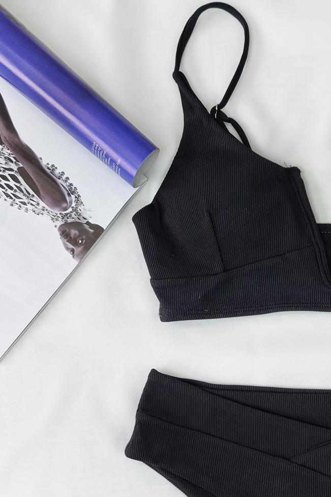 Μονόχρωμο μαύρο μαγιό μπικίνι που συνδυάζει στυλ και άνεση. Με ελαστική ριπ ύφανση, spaghetti striped μπουστάκι με ιδιαίτερο V-cut και παρτό ψηλόμεσο V-front μπικίνι σλιπ. Οι τιράντες του είναι αυξομοιούμενες και διαθέτει cups στο στήθος.