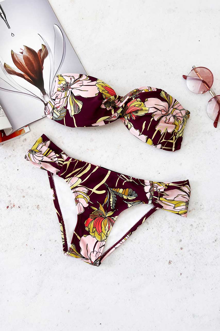 Ultimate floral μπικίνι σε έντονη burgundy απόχρωση με bandeau τοπ και χαμηλόμεσο σλιπ. Μπορεί να φορεθεί και strapless.