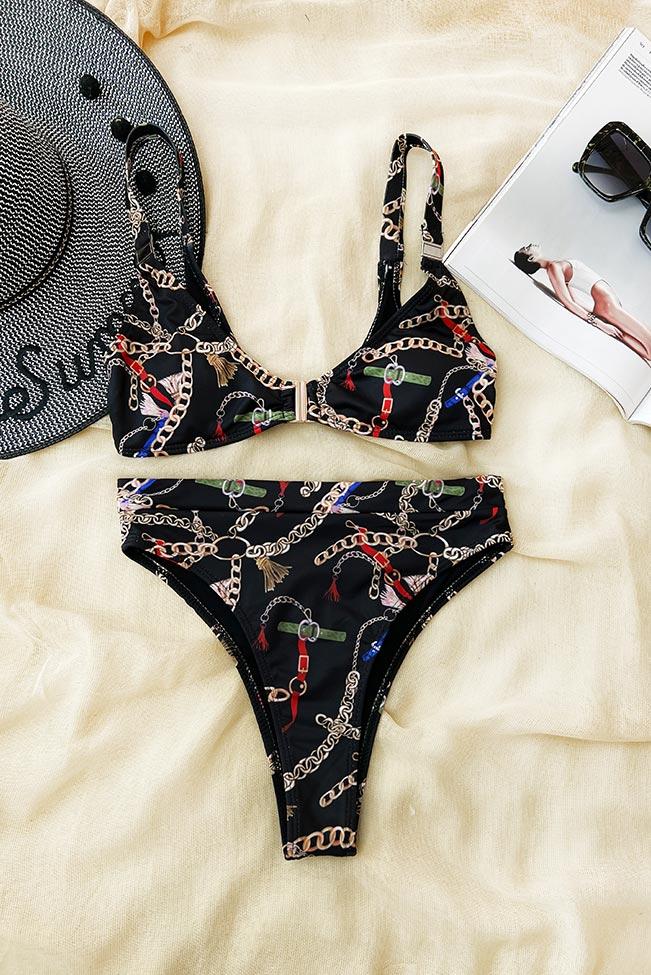 Εμπριμέ vintage style chain printed ψηλόμεσο μπικίνι με μεταλλικές λεπτομέρειες.