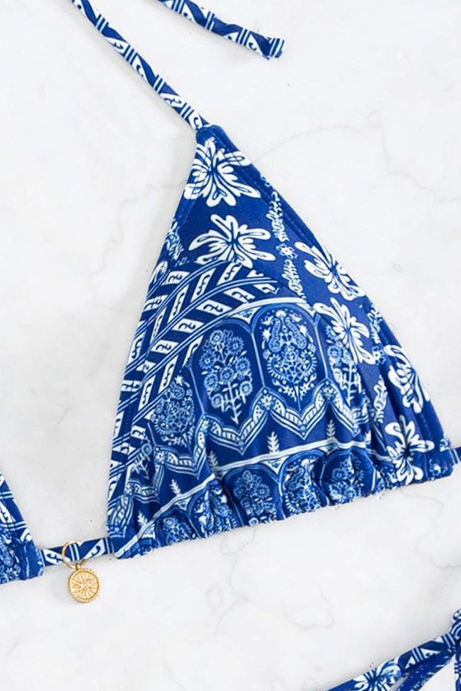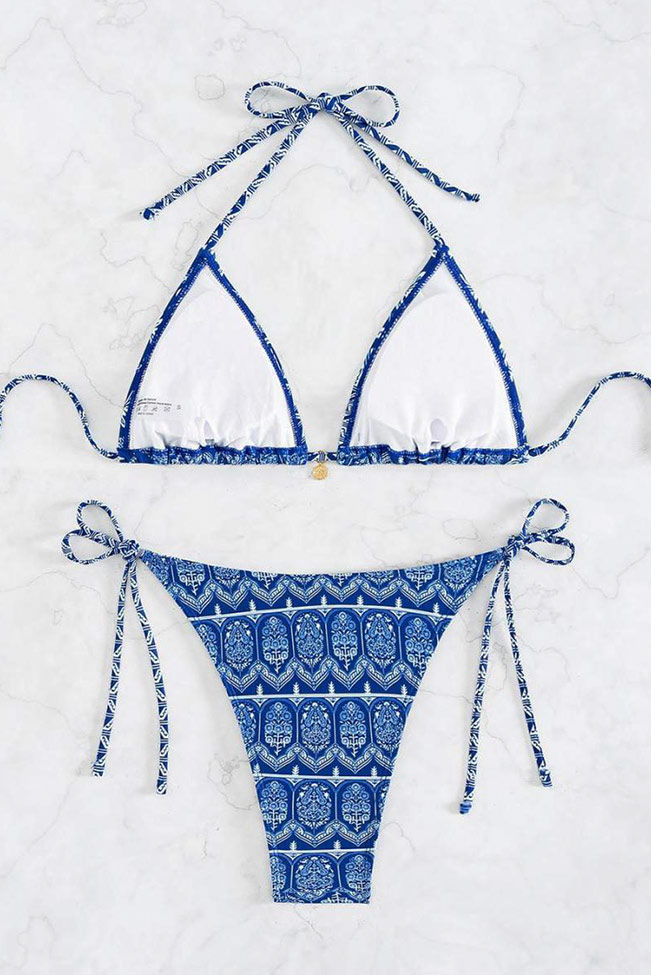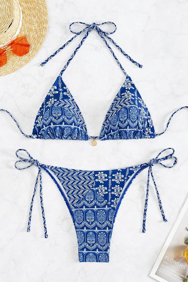 Μπικίνι σετ σε μπλε απόχρωση με διάφορα σχεδιάκια στο print.Εχει κανονική εφαρμογή και διαθέτει κορδονάκια που το κάνουν να εφαρμόζει καλύτερα στο σώμα σου.