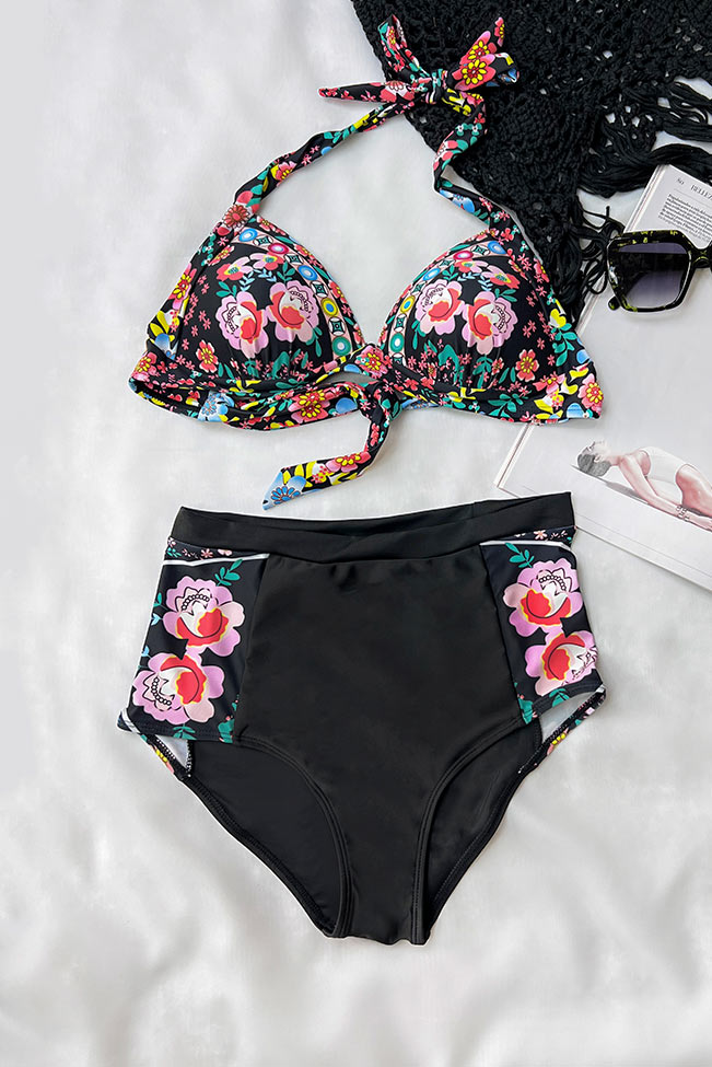 Ψηλόμεσο retro halter neck μπικίνι με japanese flowers pattern.