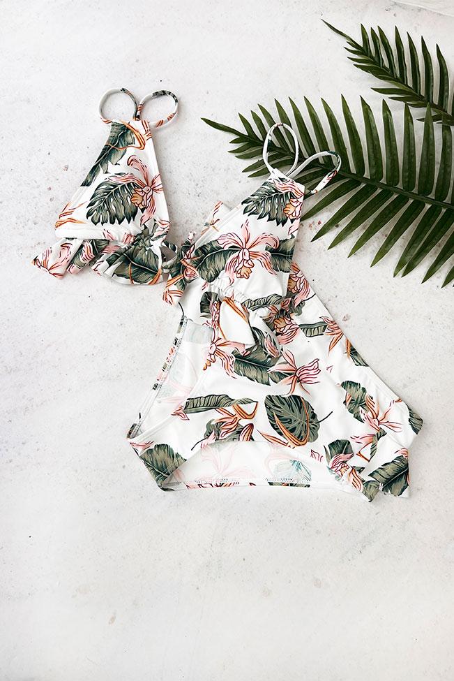 Tiki mood leaf pattern ψηλόμεσο μπικίνι σε έντονο τροπικό μοτίβο με σειρά βολάν on top και στο σλιπ.