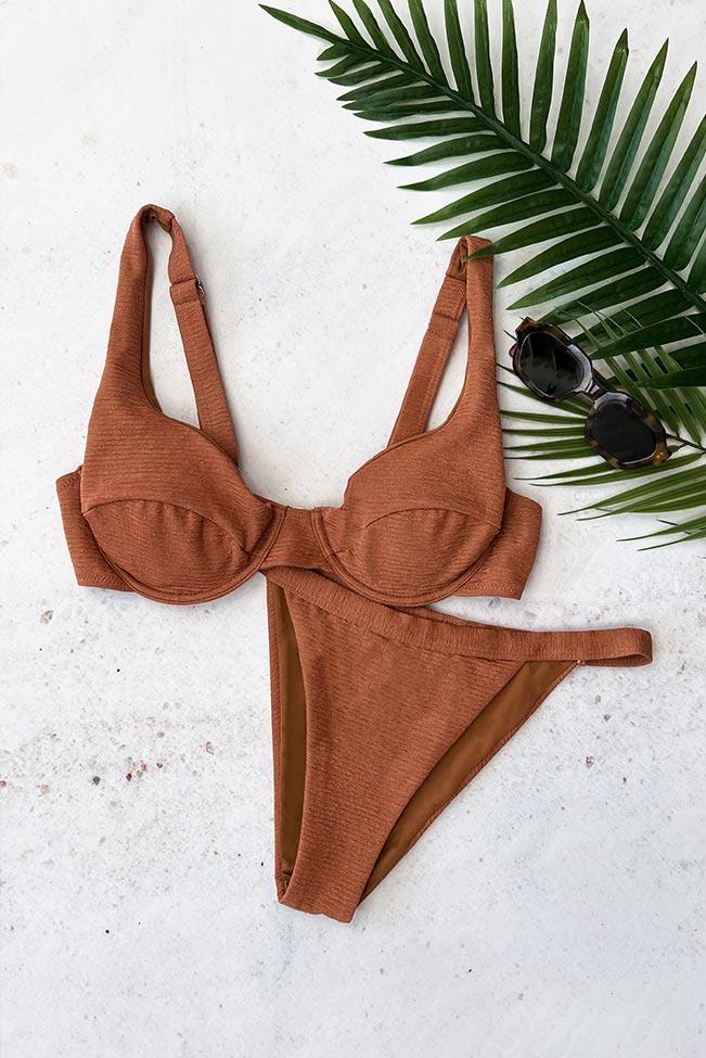 Μαγιό μπικίνι με μπανέλα στο σουτιέν και παρτό σλιπ σε καφέ χρώμα. Ένα μαγιό μπικίνι με ριπ ύφανση, αφαιρούμενη ενίσχυση και ρυθμιζόμενες τιράντες.