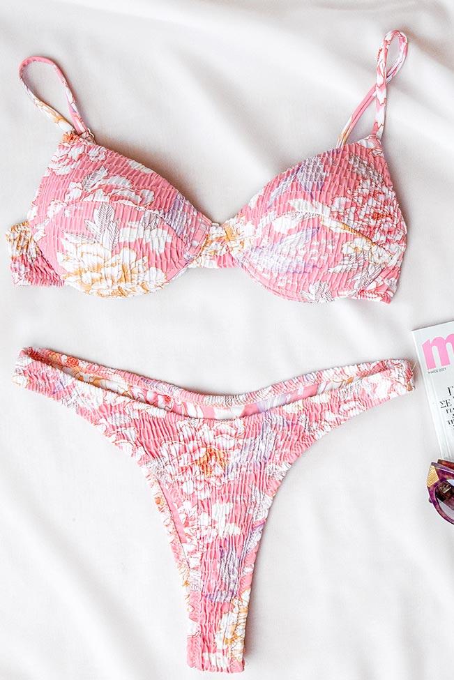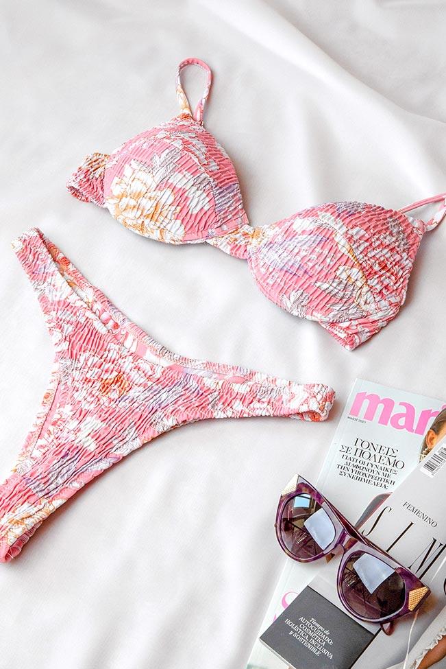 Sweet n romantic pastel ruched μπικίνι σε ροζ χρώμα με σουτιέν spaghetti stripes και χαμηλόμεσο σλιπ.
