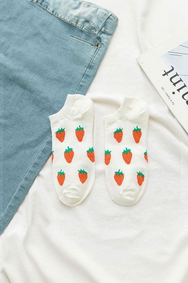 Κοντές γυναικείες κάλτσες, ελαφρώς πάνω από τον αστράγαλο, με cute σχέδιο με φράουλες και λευκή απόχρωση.