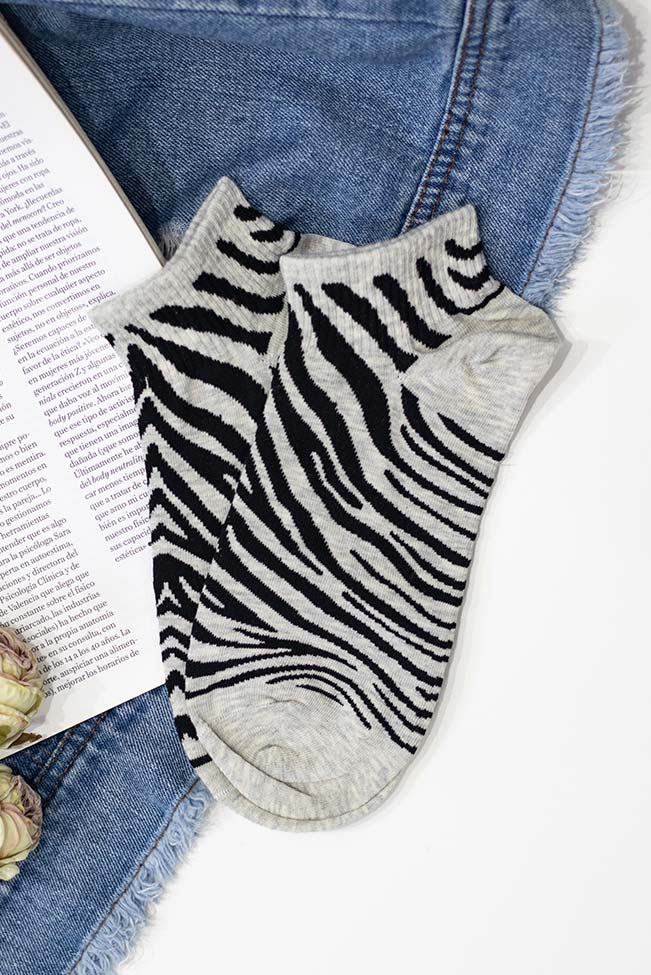 Γυναικείες κοντές κάλτσες με ζέβρα animal print σε γκρι απόχρωση, που αλλάζουν τον τρόπο που ξεκουράζεστε και προσθέτουν μια funky πινελιά στο ντύσιμο σας.
