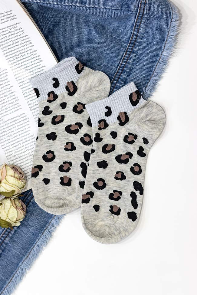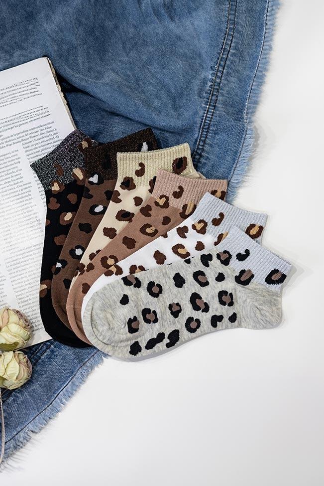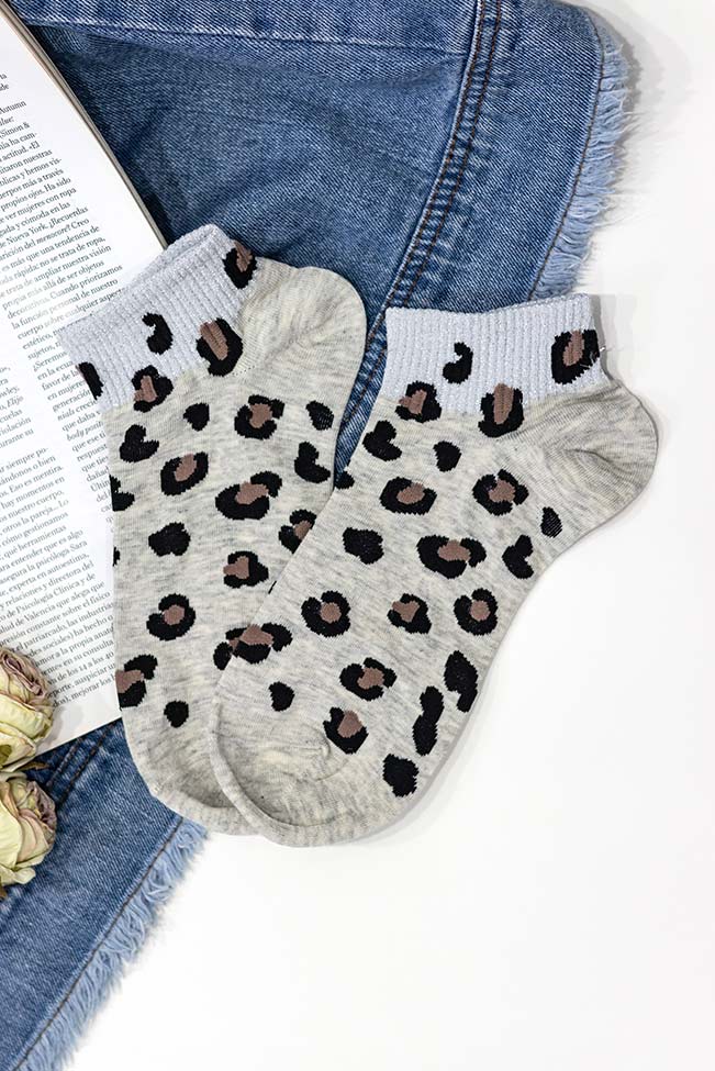 Κοντές γυναικείες κάλτσες σε γκρι, φτάνουν ελαφρώς πάνω από τον αστράγαλο, με cute λεοπάρ σχέδιο και lurex. Είναι onesize και καλύπτει απο νούμερο 35 μέχρι 39.