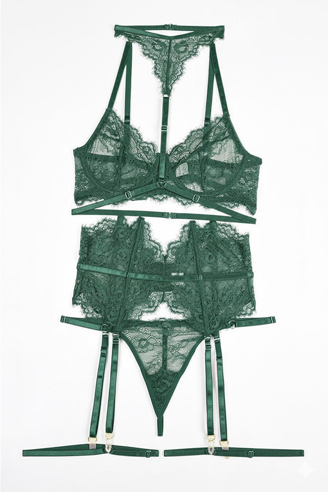 Αυτό το πράσινο σετ εσωρούχων δαντελένιο με ζαρτιέρες συνδυάζει κομψότητα και αισθησιασμό με τρόπο μοναδικό. Από την πρώτη στιγμή που θα το φορέσεις, θα νιώσεις τη διαφορά. Η απαλή δαντέλα αγκαλιάζει το σώμα, ενώ οι λεπτές σατινέ τιράντες προσθέτουν μια αίσθηση πολυτέλειας. Επιπλέον, οι ρυθμιζόμενες λεπτομέρειες εξασφαλίζουν τέλεια εφαρμογή σε κάθε σιλουέτα.