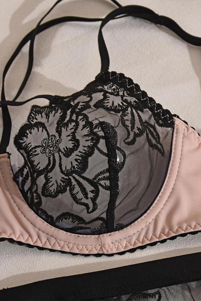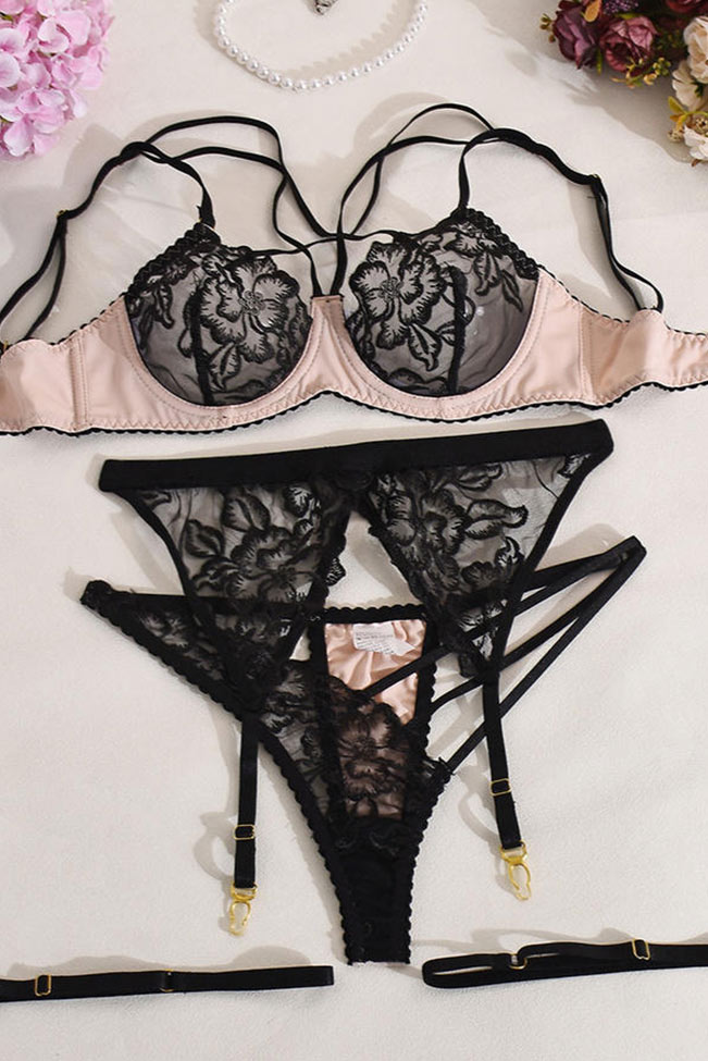 Το σετ εσωρούχων δαντελένιο με ζαρτιέρες συνδυάζει την απόλυτη θηλυκότητα με τη σύγχρονη αισθητική. Το πάνω μέρος διαθέτει ημιδιάφανα cups από μαύρη δαντέλα με floral σχέδιο, που αγκαλιάζουν το στήθος προσφέροντας φυσική ανόρθωση και εντυπωσιακή εμφάνιση. Οι λεπτές τιράντες δημιουργούν ένα παιχνιδιάρικο “cage effect” στο μπούστο, χαρίζοντας ένταση και στυλ.