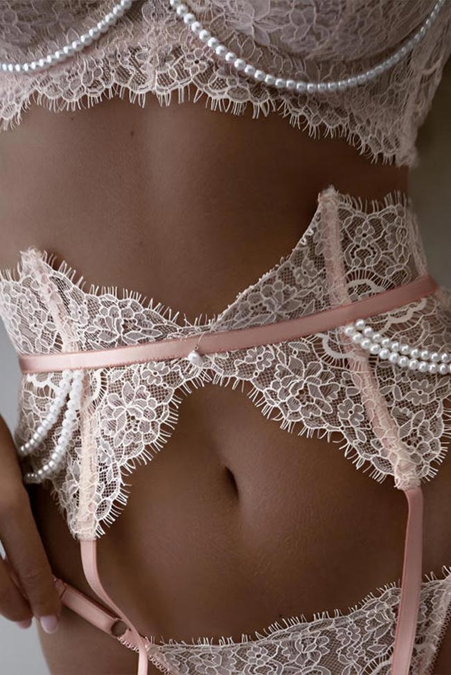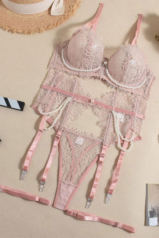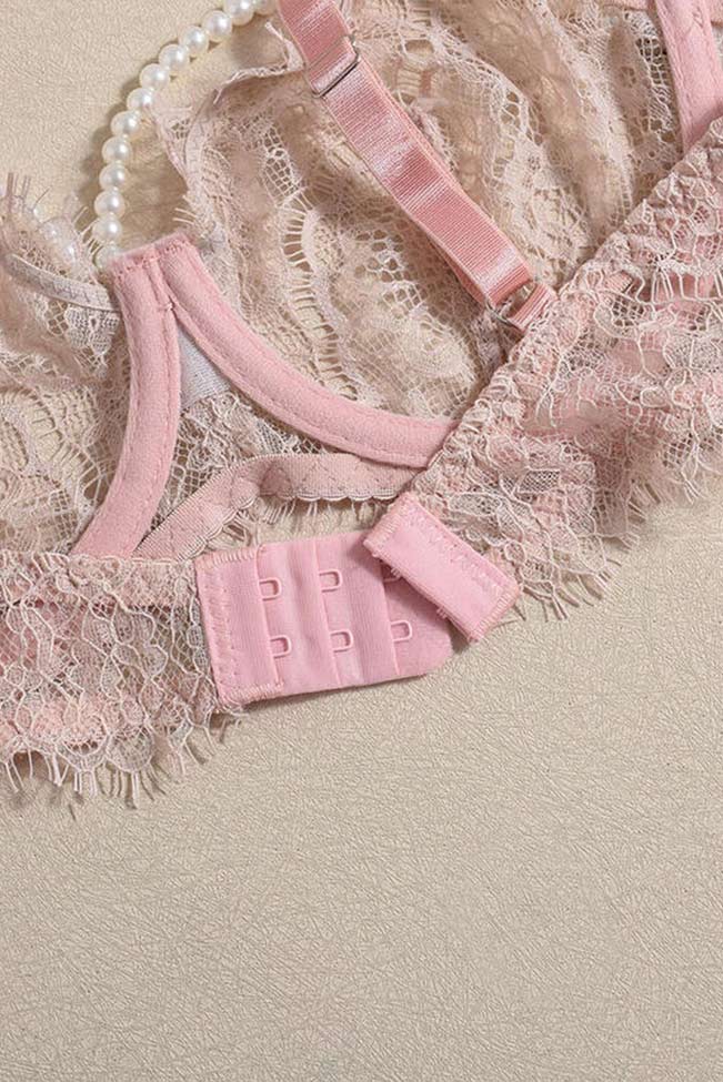 Σετ εσωρούχων δαντελένιο με ζαρτιέρες και πέρλες – Ροζ