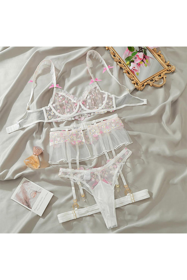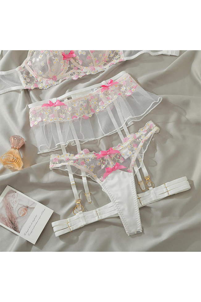 Το σετ εσωρούχων με ζαρτιέρες είναι η απόλυτη επιλογή για κάθε γυναίκα που θέλει να αναδείξει τη θηλυκότητά της. Ο συνδυασμός διάφανου τούλι με κεντημένα λουλούδια δημιουργεί μια ρομαντική αίσθηση, ενώ οι ροζ φιόγκοι προσθέτουν παιχνιδιάρικες λεπτομέρειες. Αυτό το σετ lingerie δεν εντυπωσιάζει μόνο με το σχέδιό του, αλλά και με την άνεση που προσφέρει.